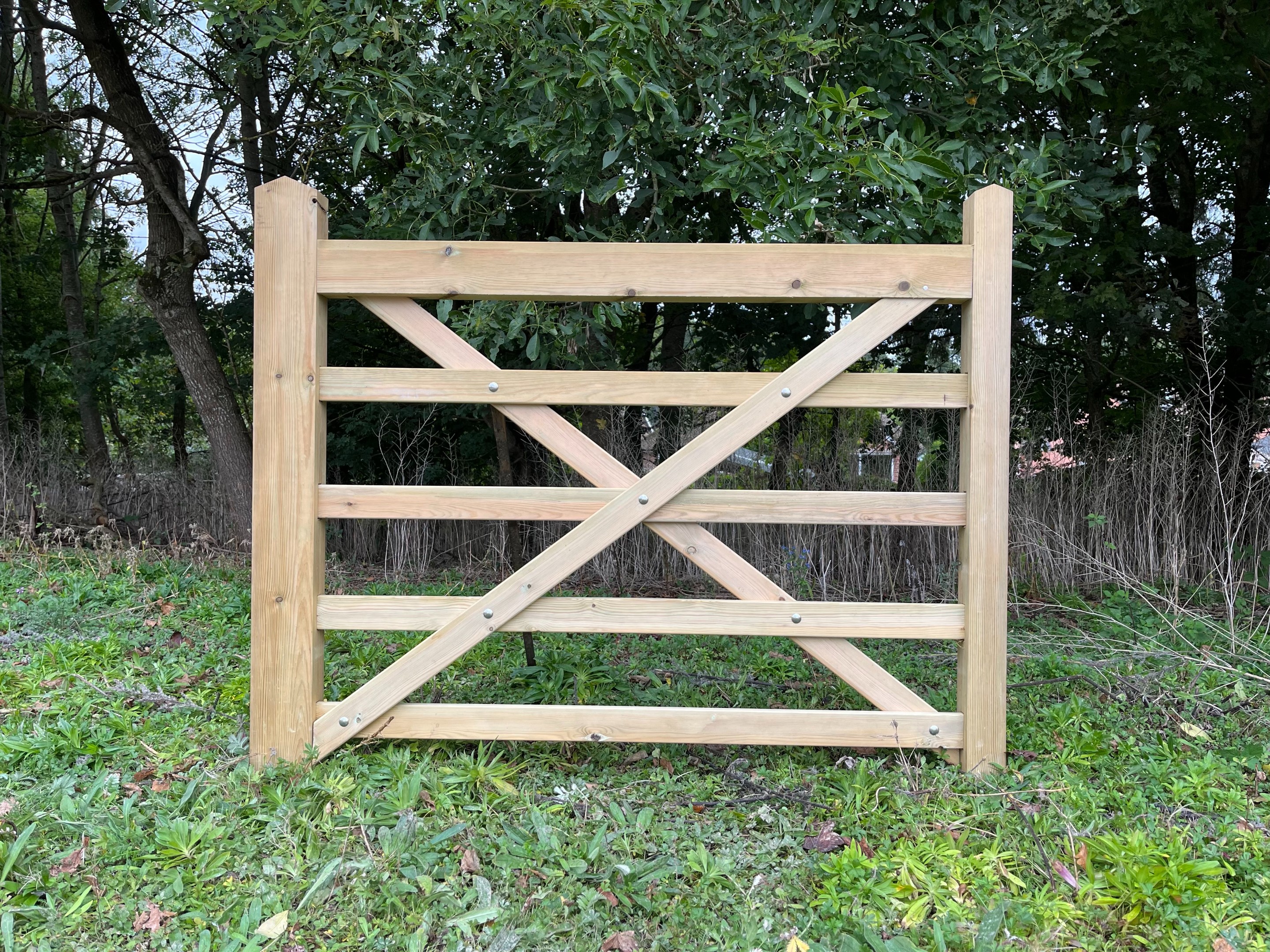 Image shows a left hand hanging 5'0 wide gate. The 5'0 gate is a diamond braced gate