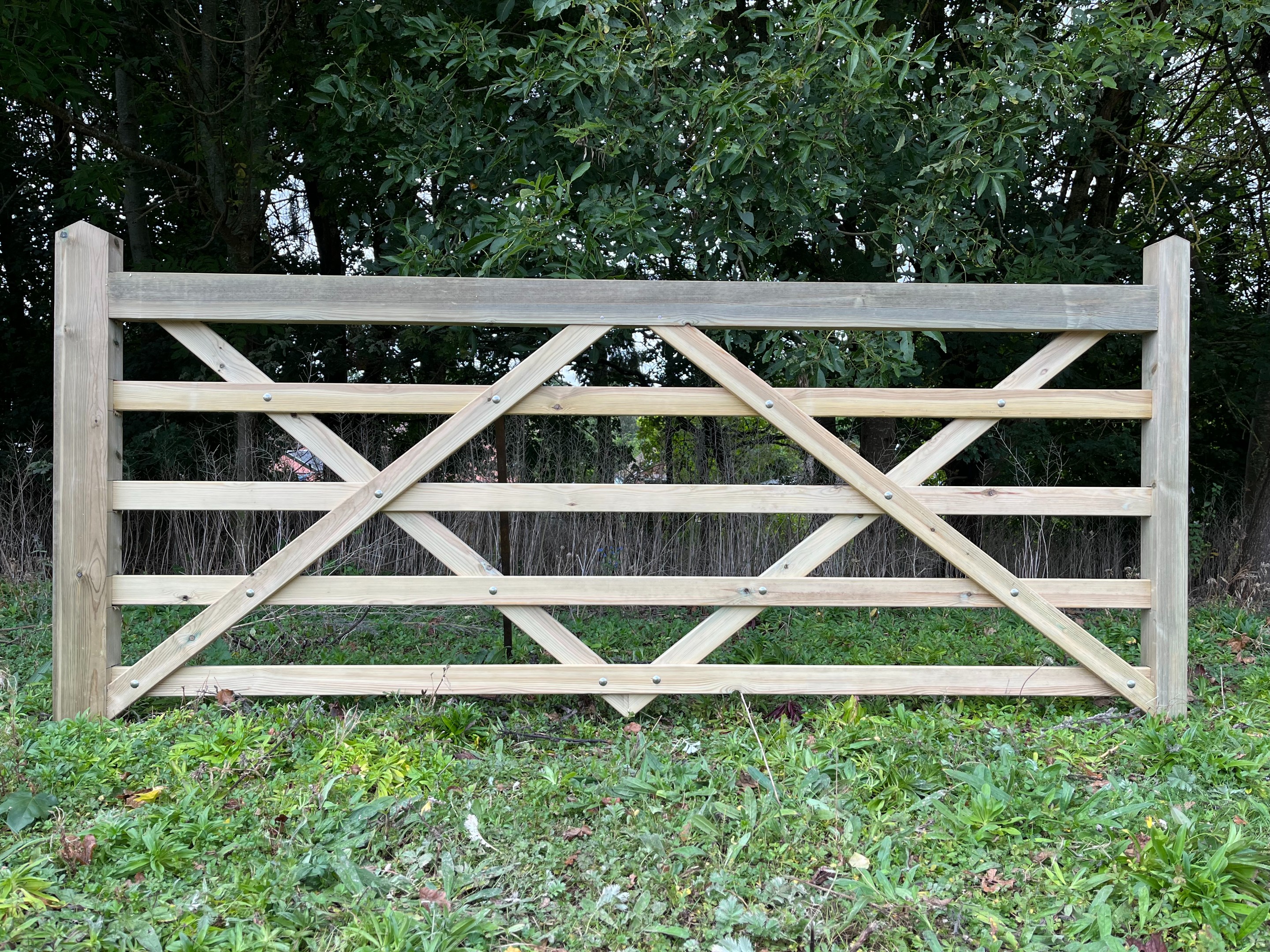 Image shows a left hand hanging 12'0 wide gate. The 9'0 gate is also double diamond braced
