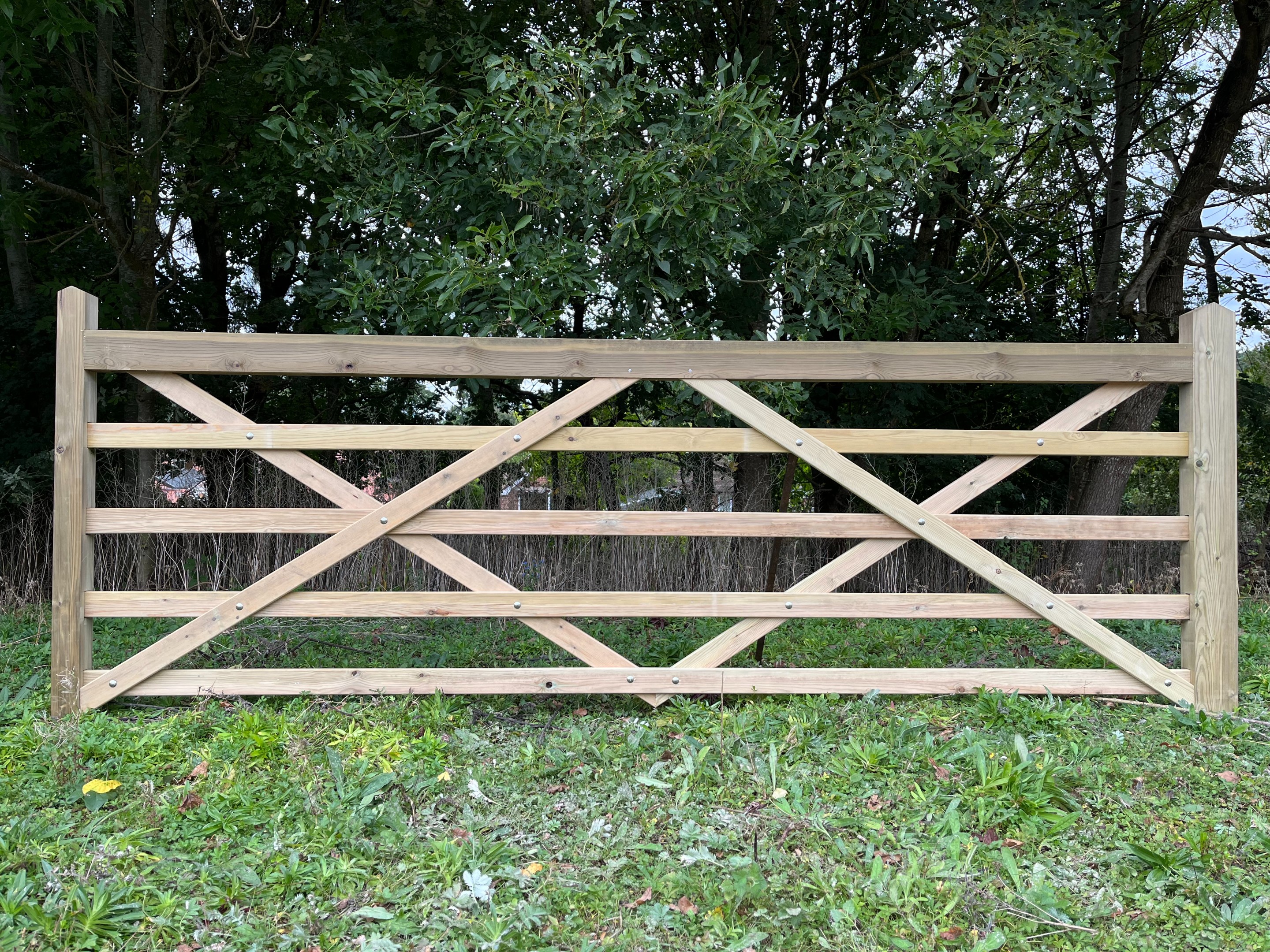 Image shows a left hand hanging 12'0 wide gate. The 11'0 gate is also double diamond braced